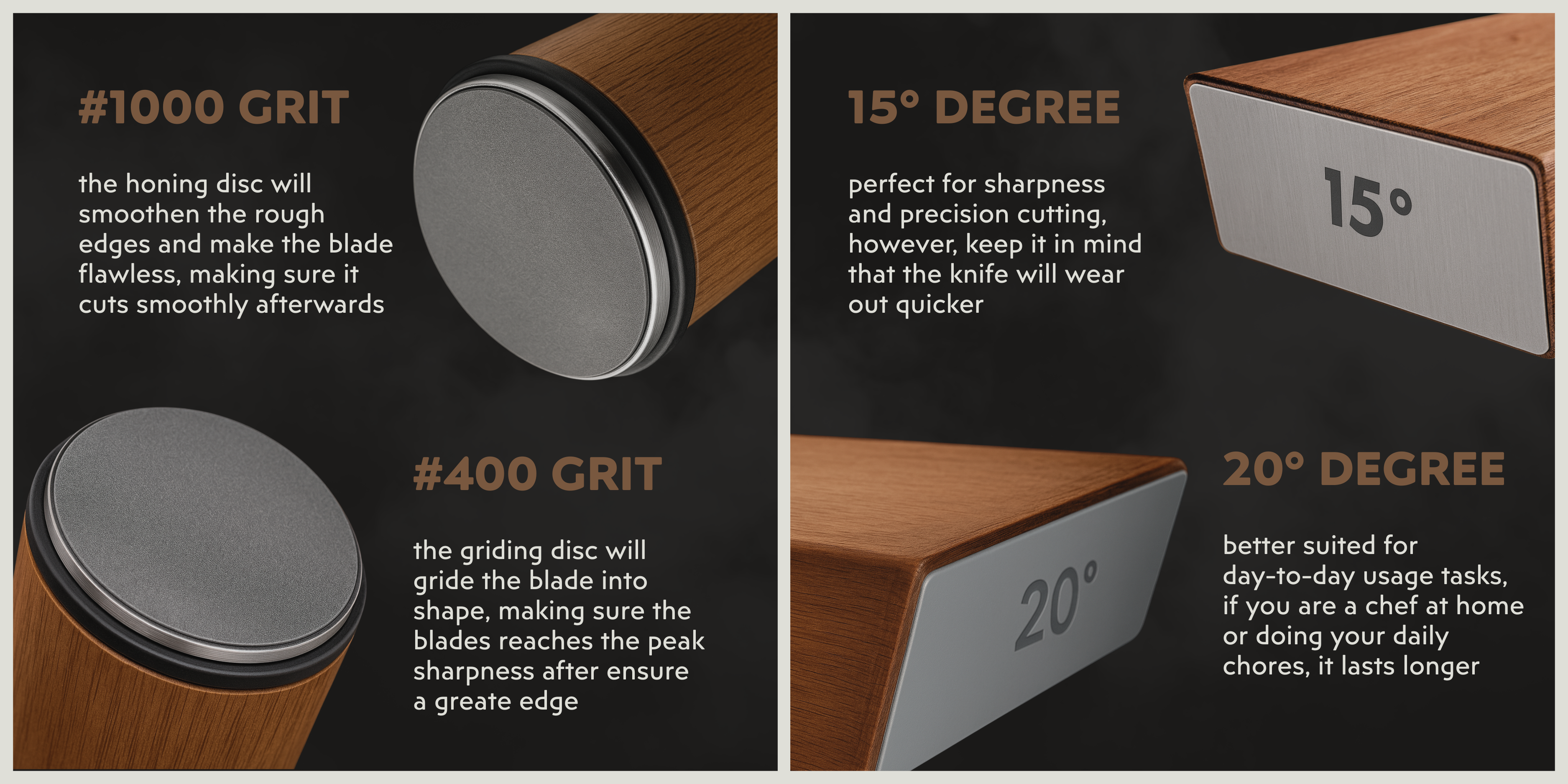 In principle, kitchen knives of any quality can be sharpened at 20°. However, depending on the condition of the blade and the quality of the steel, many knives can be sharpened to an even finer edge at 15°. You can find out whether your knives are suitable for this by sharpening them on the 15° side for three to five minutes. If the sharpness is not satisfactory, it is advisable to use the 20° grinding angle.